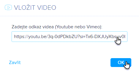4. Vložte odkaz z Youtube nebo Vimeo a potvrďte tlačítkem OK.