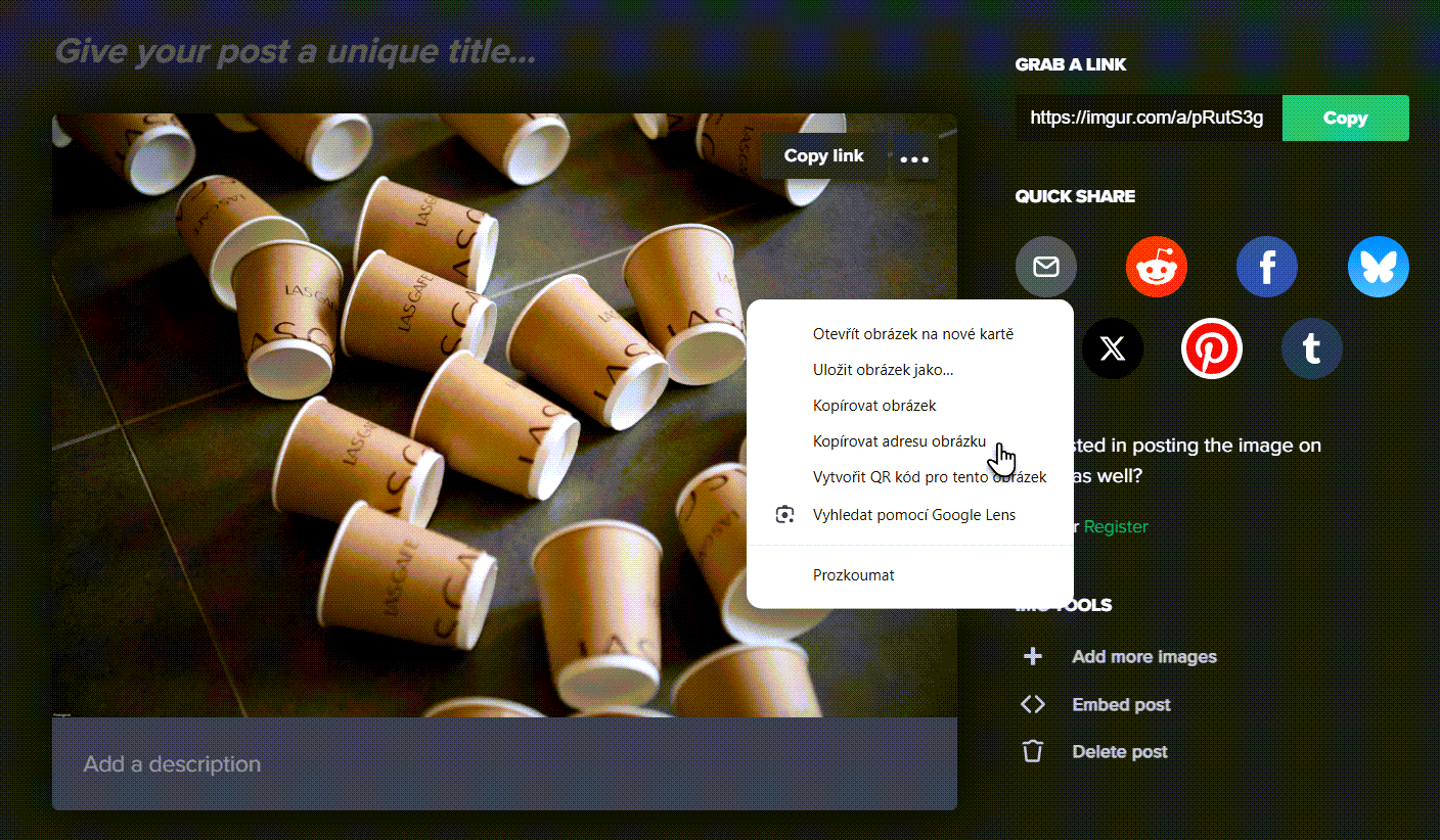 1. Nejprve je třeba nahrát obrázek na uložiště a získat související odkaz – v tomto ohledu doporučujeme externí stránku Imgur.com. Zde jednoduše vložíte obrázek, po jeho nahrání na něj kliknete pravým tlačítkem a zvolíte možnost Kopírovat adresu obrázku.