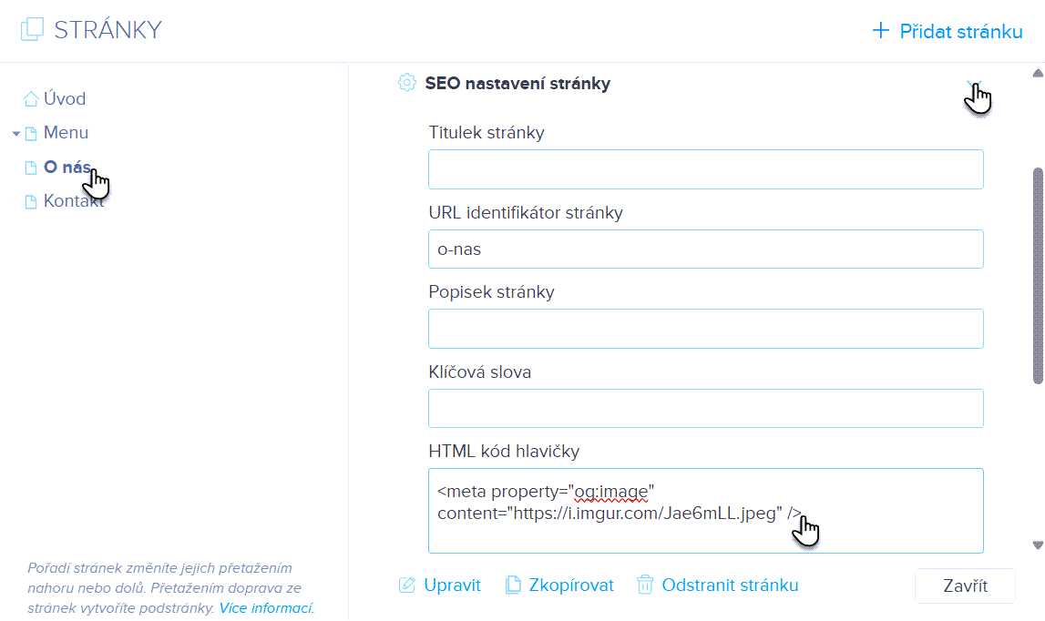 2. Vyberte požadovanou stránku, rozklikněte SEO nastavení stránky a do pole HTML kód hlavičky vložte daný kód. Takto pak postupujete i pro všechny další stránky svého webu.