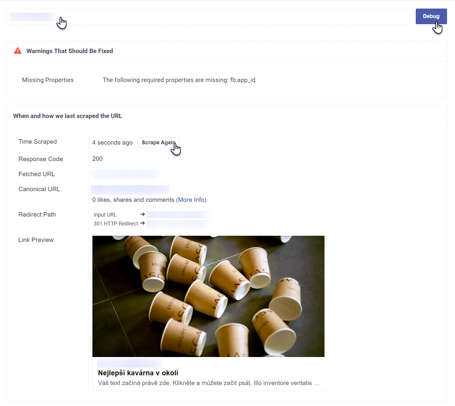 Nyní bude třeba ještě použít nástroj Sharing Debugger, díky kterému promažete cache pro sdílení. Zde vložte adresu svých webových stránek (nebo jednotlivých stránek webu) a klikněte na tlačítko Debug. Níže na stránce naleznete náhled sdíleného odkazu. Pokud se obrázek neaktualizoval, použijte možnost Scrape again.
