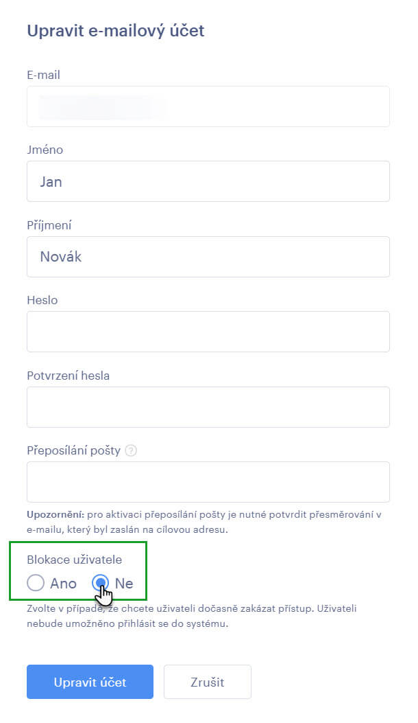 2.2 Blokace e-mailové schránky v administraci projektu