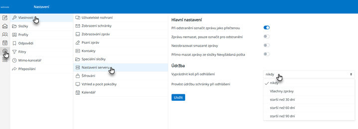TIP: V rámci nastavení lze také nastavit automatické mazání pošty. To provedete tak, že ve schránce zvolíte Nastavení, dále Vlastnosti a poté Nastavení serveru, kde si vyberte, kdy chcete koš vyprázdnit.