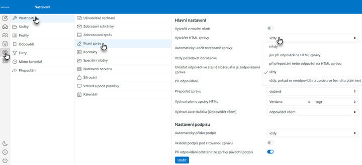 Pokud se vám v automatickém podpisu v psaném e-mailu nezobrazuje vložený, nemáte povoleno HTML, v tomto ohledu postačí jej povolit. To uděláte tak, že ve schránce zvolíte Nastavení, dále Vlastnosti a poté Psaní zpráv, kde povolíte vytváření HTML zpráv.