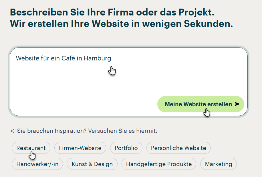 2. Beschreiben Sie, welche Art von Website Sie erstellen möchten oder wählen Sie eine der vorgeschlagenen Kategorien aus und klicken Sie auf Meine Website erstellen.