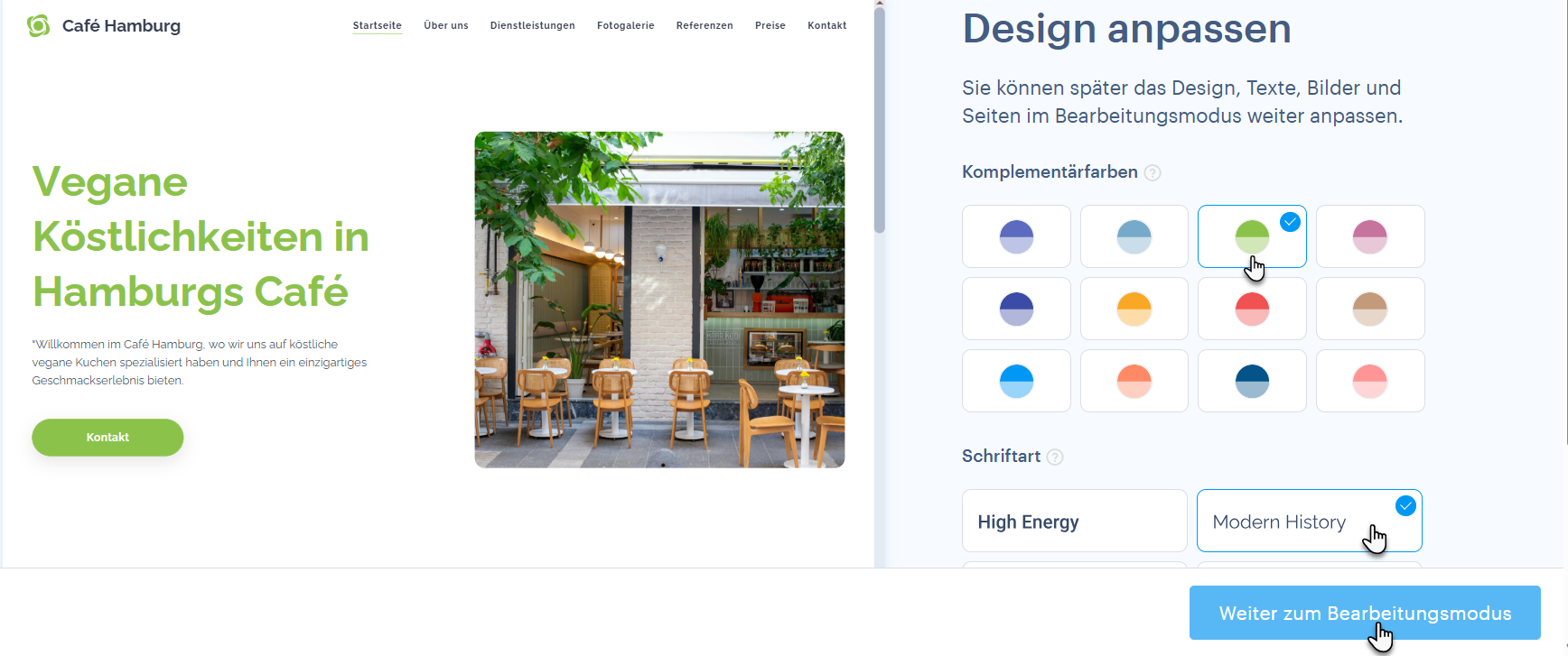 6. Bei der Anpassung der generierten Designs können Sie die Farbe der Website und die auf den Seiten verwendete Schriftart auswählen.