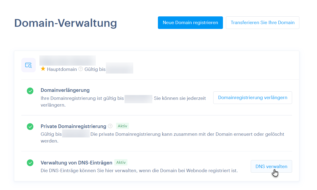 2. Klicken Sie neben der gewünschten Domain auf die Schaltfläche DNS verwalten.