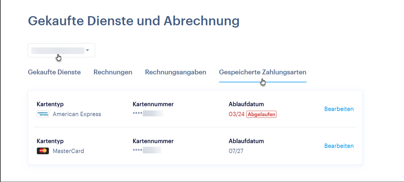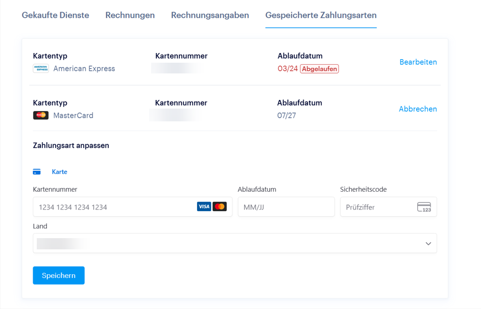 Diese Anleitung behandelt nur die Aktualisierung der Zahlungskarte für zukünftige automatische Verlängerungen. Wenn Sie einen Dienst vollständig kündigen oder eine andere Zahlungsmethode wählen möchten, befolgen Sie bitte die Anleitung Automatischen Verlängerungen.