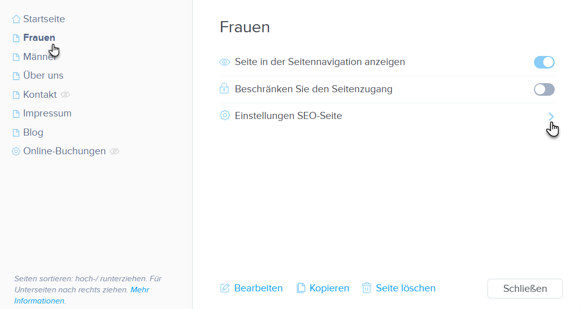 2. Wählen Sie eine Seite aus und öffnen Sie den Abschnitt Einstellungen SEO-Seite.