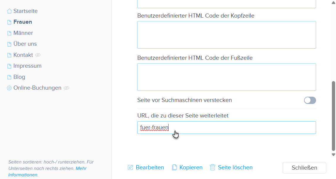Ihre Seite hat im Editor die URL „website.de/mein-alter-link-im-netz“, aber Sie möchten „website.de/mein-link“ verwenden und teilen, ohne eine direkte Änderung im Editor vorzunehmen.