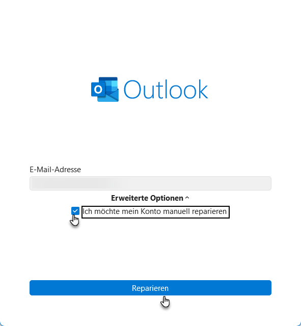 4. Erweitern Sie den Abschnitt Erweiterte Optionen und aktivieren Sie Ich möchte mein Konto manuell reparieren. Fahren Sie fort, indem Sie auf Reparieren klicken.