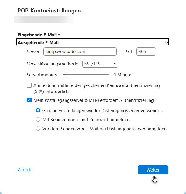 6. Ändern Sie im Feld Server den Wert in smtp.mail.webnode.com und klicken Sie auf Weiter.