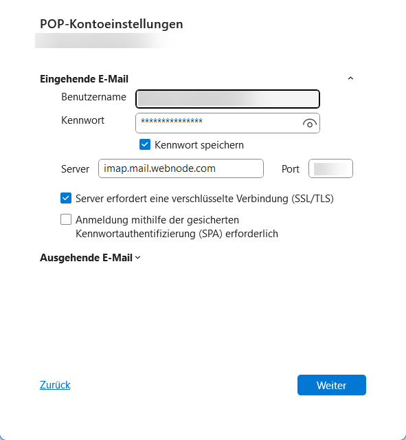 5. Ändern Sie im Feld Server den Wert in imap.mail.webnode.com und klicken Sie auf Ausgehende E-Mail.