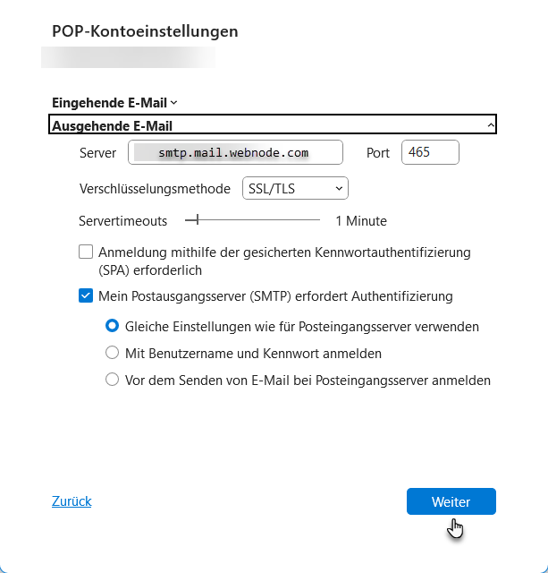 6. Ändern Sie im Feld Server den Wert in smtp.mail.webnode.com und klicken Sie auf Weiter.