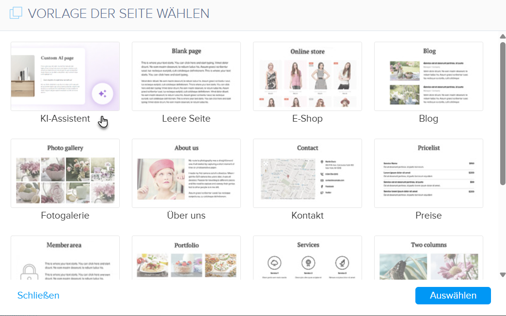 Die KI-gestützte Seitenerstellung ist in den Premium-Paketen Standard, Profi und Business verfügbar.