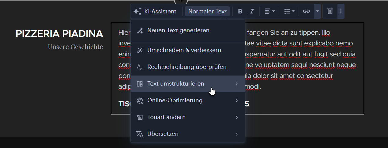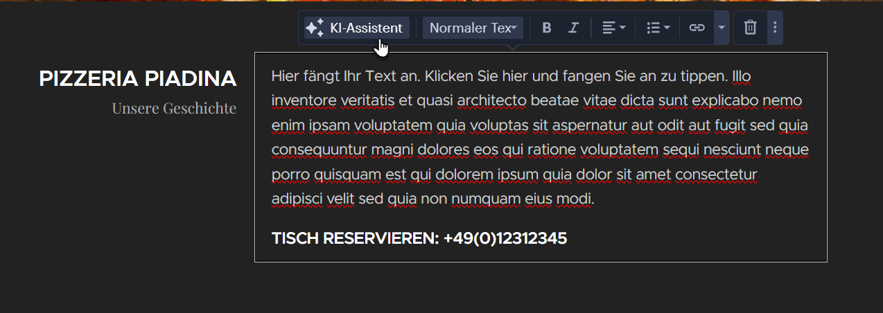 1. Klicken Sie im Editor in ein Textfeld und wählen Sie die Option KI-Assistent. Informationen zum Erstellen neuer Texte mit künstlicher Intelligenz finden Sie in unserer Anleitung Einen Text mit dem KI-Assistenten erstellen.
