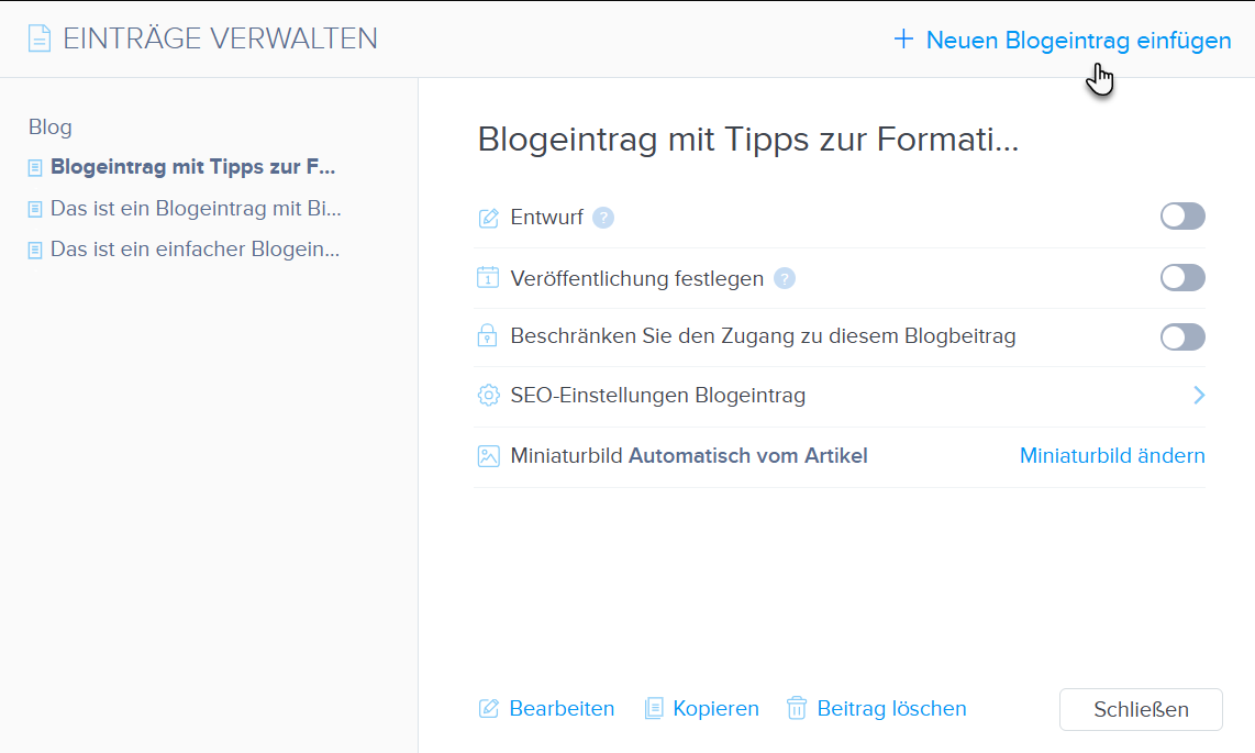 1. Klicken Sie im Editor auf Blogeinträge (beachten Sie, dass ein Blog auf der Website sein muss).