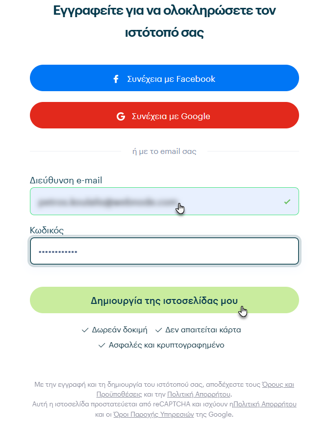 3. Εγγραφείτε στο λογαριασμό σας. Εάν έχετε ήδη λογαριασμό, εισαγάγετε τα στοιχεία σύνδεσης. Κάντε κλικ στο κουμπί Δημιουργία ιστοσελίδας.