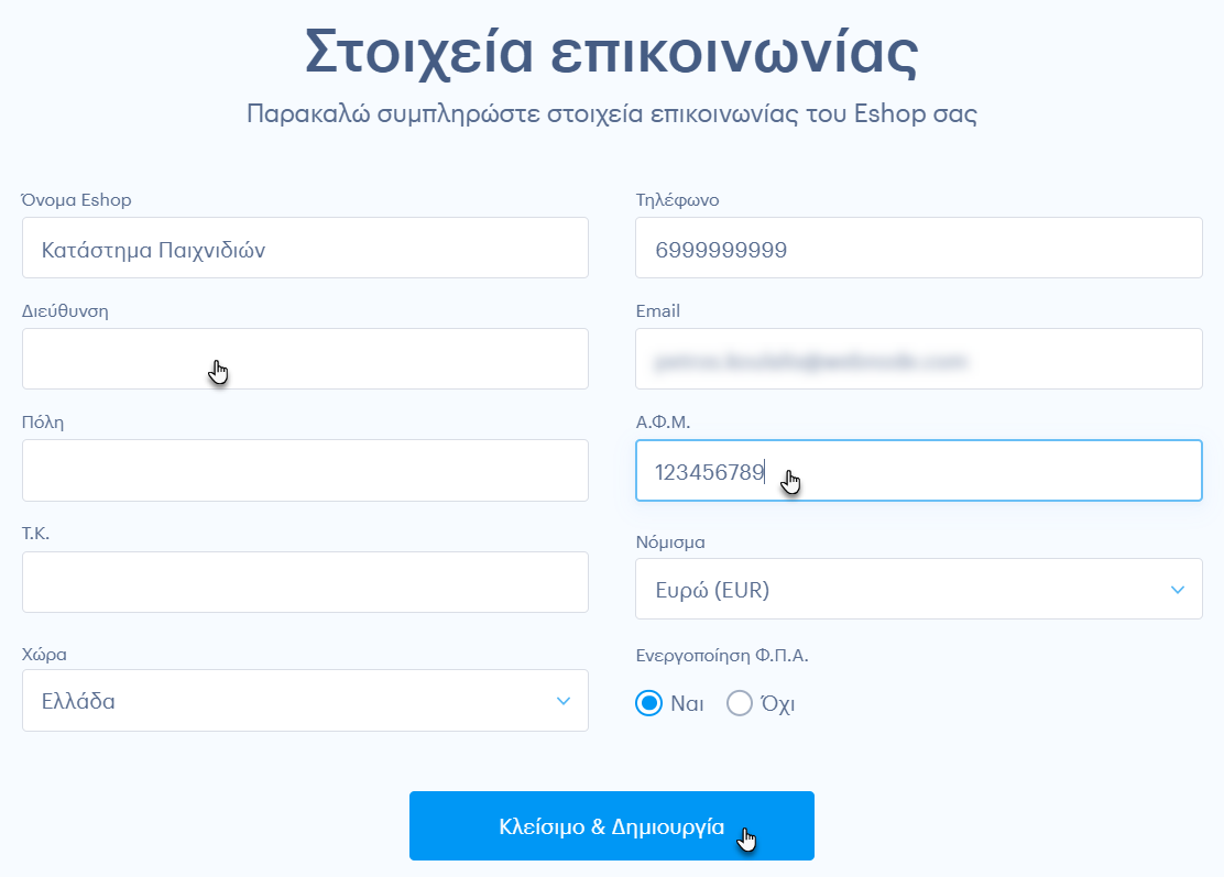 5. Συμπληρώστε τα στοιχεία επικοινωνίας του ηλεκτρονικού σας καταστήματος. Μπορείτε να αλλάξετε αυτές τις πληροφορίες αργότερα, αν χρειαστεί.