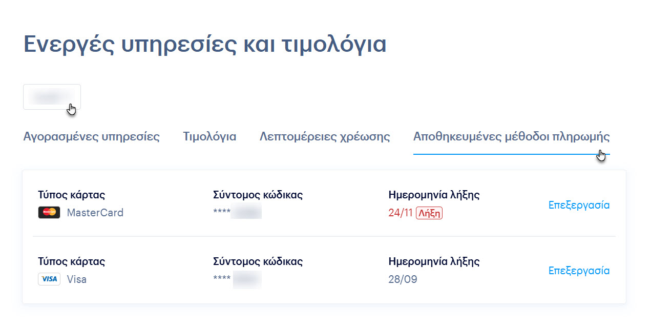 Σε αυτήν την ενότητα, η κάρτα θα εμφανίζεται μόνο μία φορά, ακόμη και αν χρησιμοποιείται για πολλαπλές συνδρομές στο πλαίσιο του project. Εμφανίζονται μόνο οι κάρτες που είναι συνδεδεμένες με ενεργές συνδρομές. Οι κάρτες που έχουν λήξει επισημαίνονται με κόκκινο χρώμα. Οποιαδήποτε κάρτα μπορεί να αντικατασταθεί με άλλη (δεν είναι απαραίτητο να έχει λήξει).