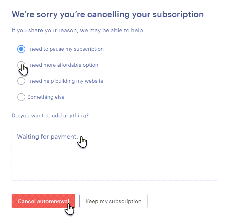 6. Select a reason for cancellation; you can also add a handwritten note, then continue by clicking the Cancel subscription button.