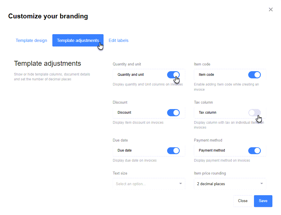 Under the Template adjustments tab, you can set the visibility of individual invoice fields, document details, and the number of decimal places for rounding.