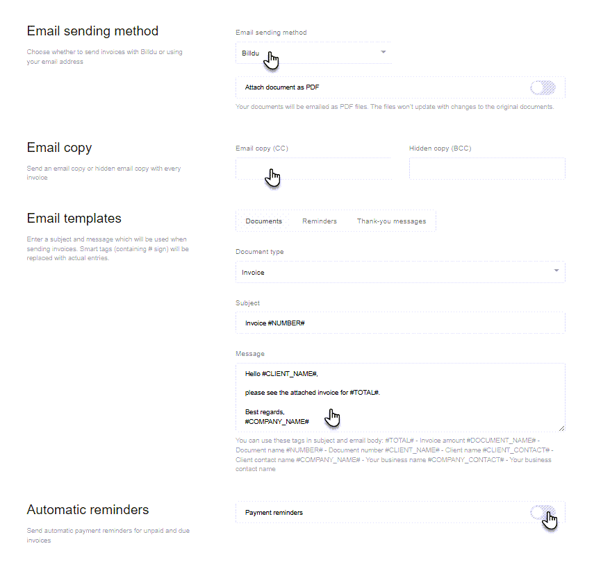 You can also configure email communication, including notification formats for sending documents. Additionally, you can enable reminders for unpaid invoices, which will notify customers about pending payments.