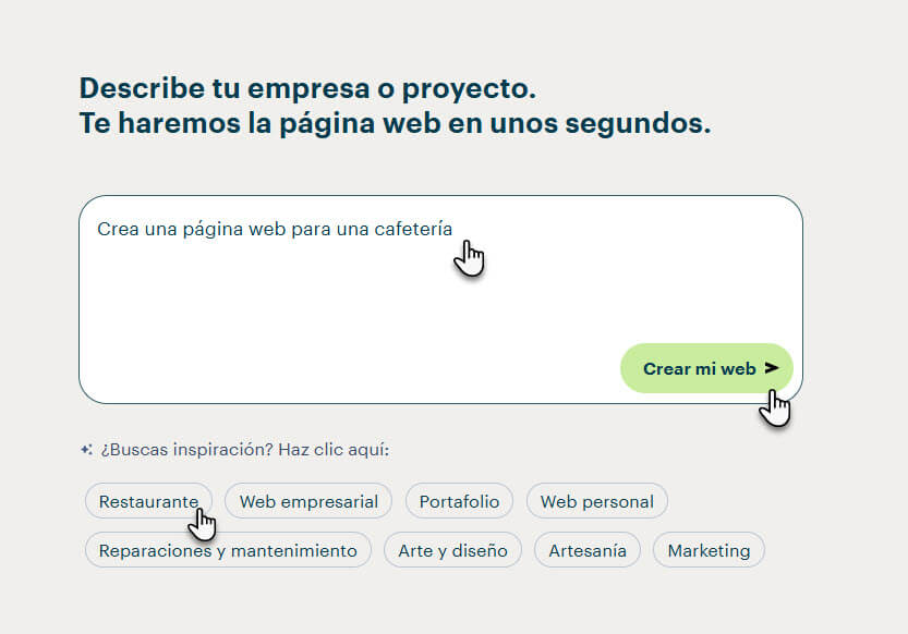 2. Describe el tipo de sitio web que quieres crear o selecciona una de las categorías sugeridas. Después haz clic en Crear mi web.