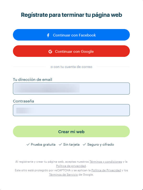 3. Regístrate. Si ya tienes una cuenta, introduce tus datos de acceso. Haz clic en el botón Crear mi web.