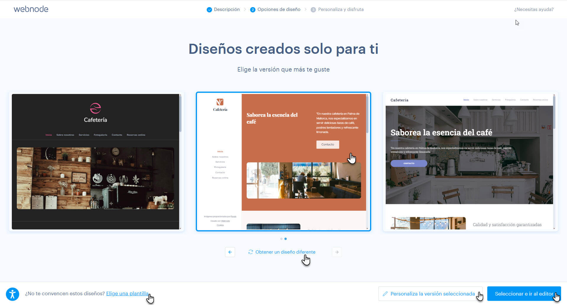 5. Aquí puedes elegir uno de los diseños generados por inteligencia artificial y modificarlo con el botón Personaliza la versión seleccionada. También puedes probar otros diseños con el botón Obtener un diseño diferente (si quieres, podrás volver a los diseños anteriores). Si prefieres elegir una de las plantillas de Webnode, haz clic en el botón Elige una plantilla.