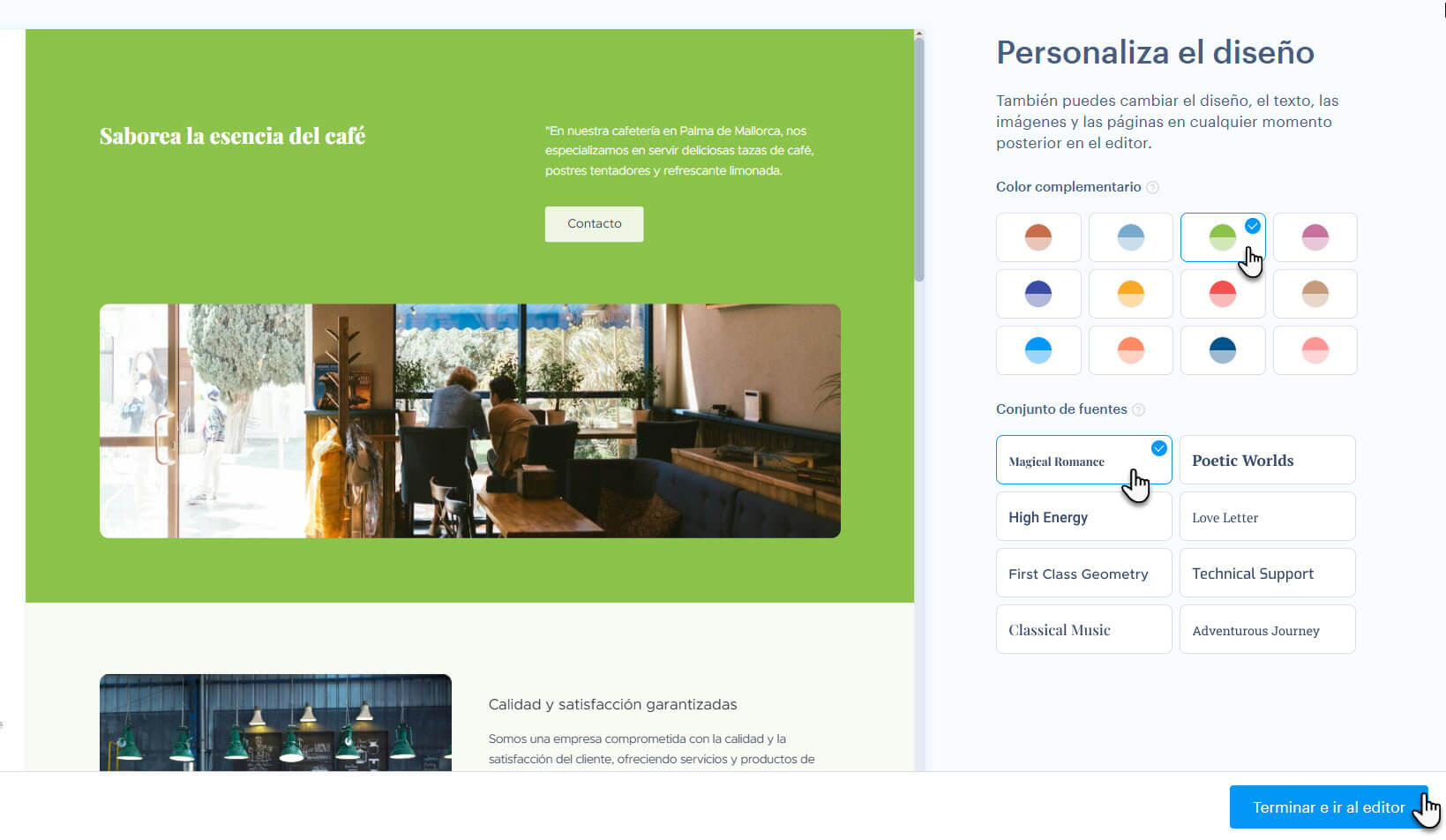 6. Al personalizar un diseño generado, podrás elegir el color del sitio web y la fuente utilizada en las páginas.