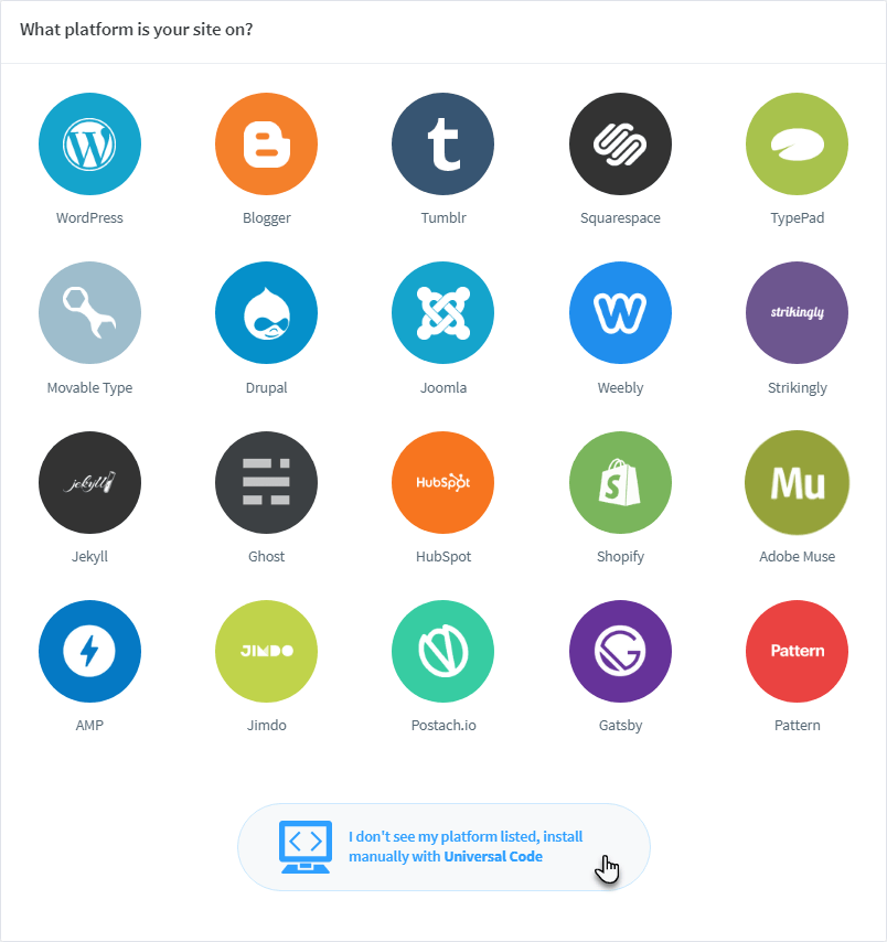 6. Selecciona I don't see my platform listed, install manually with Universal Code (No veo mi plataforma en la lista, instalar manualmente con código universal).