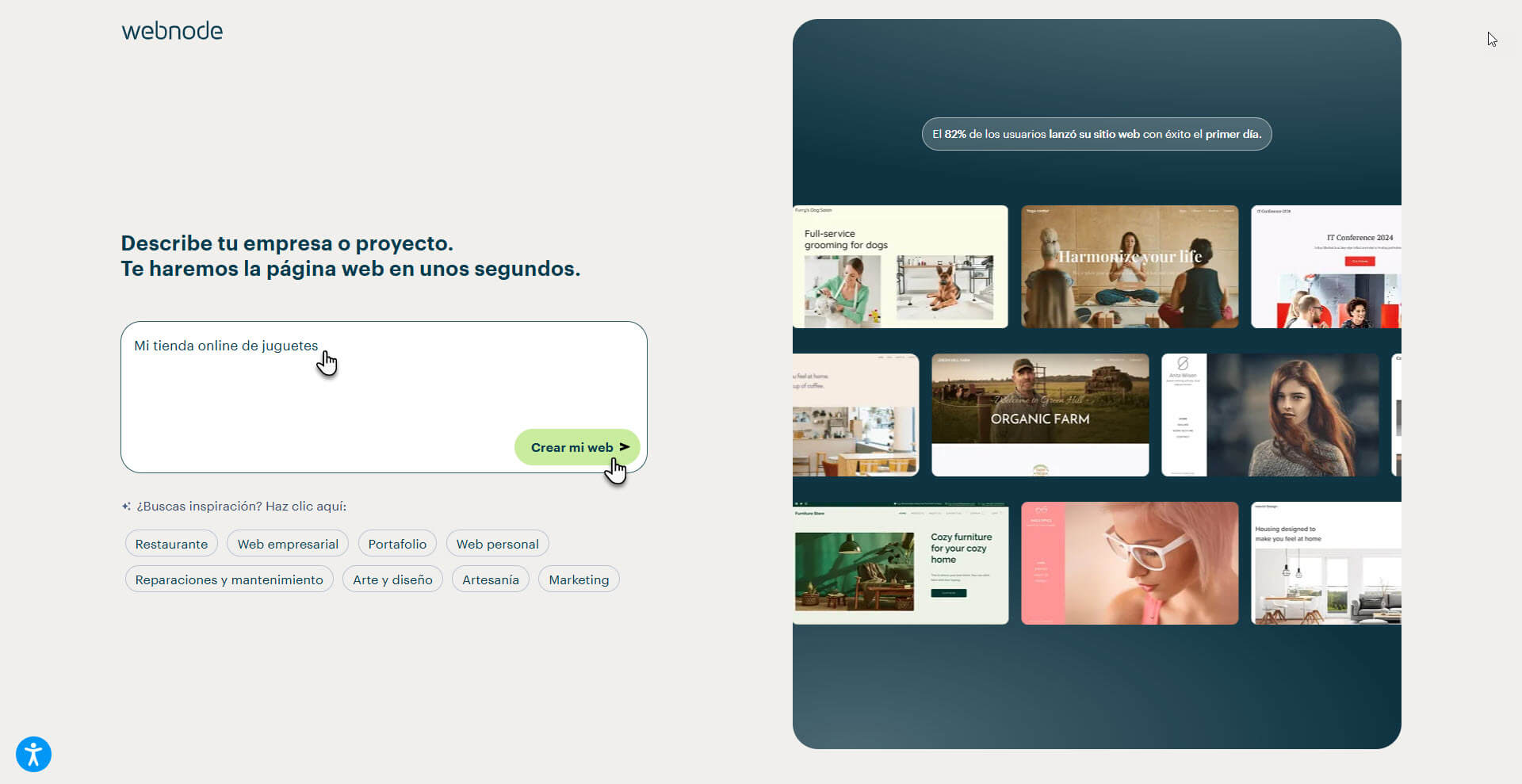 2. Describe el tipo de sitio web que quieres crear o selecciona una de las categorías sugeridas. Después haz clic en Crear mi web.