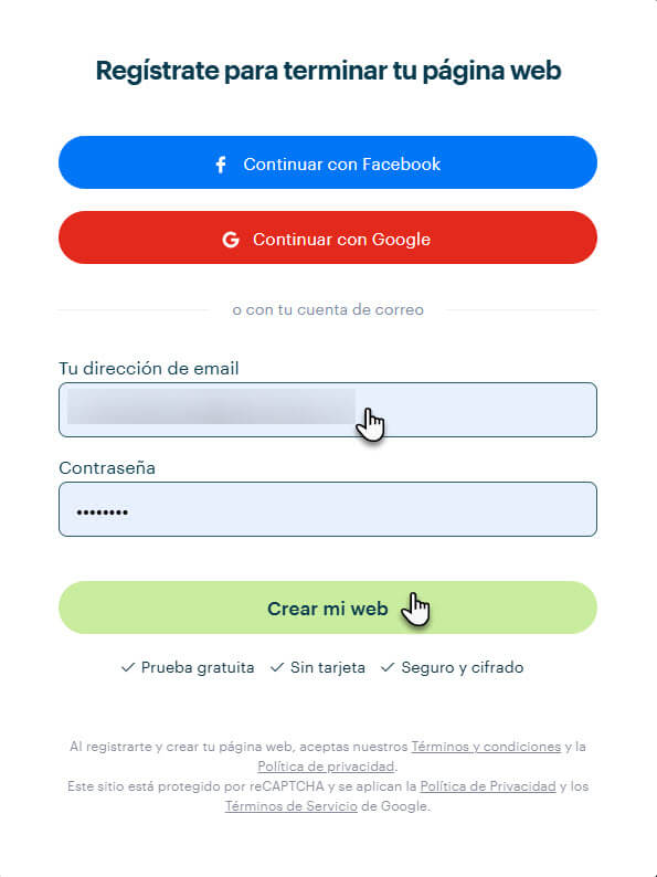 3. Regístrate. Si ya tienes una cuenta, introduce tus datos de acceso. Haz clic en el botón Crear mi web.