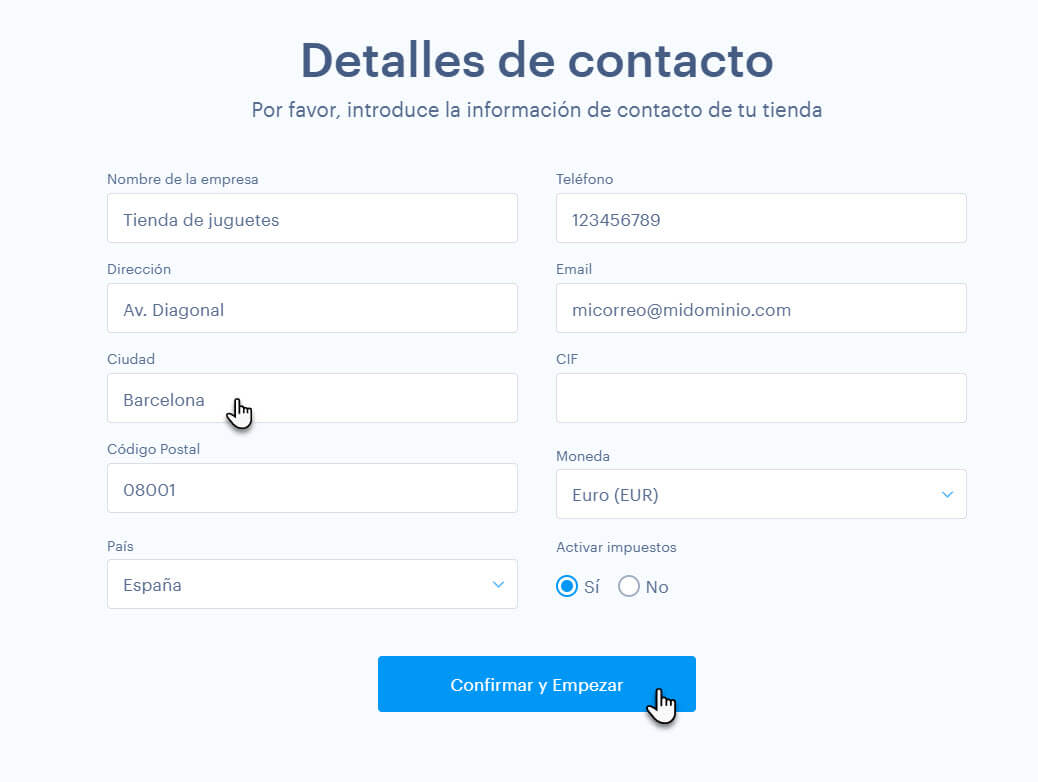 5. Introduce los datos de contacto de tu tienda online. Podrás modificarlos cuando sea necesario.