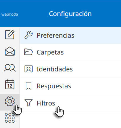 2. En la interfaz de webmail, haz clic en el ícono de rueda dentada en el panel izquierdo y luego selecciona Filtros.