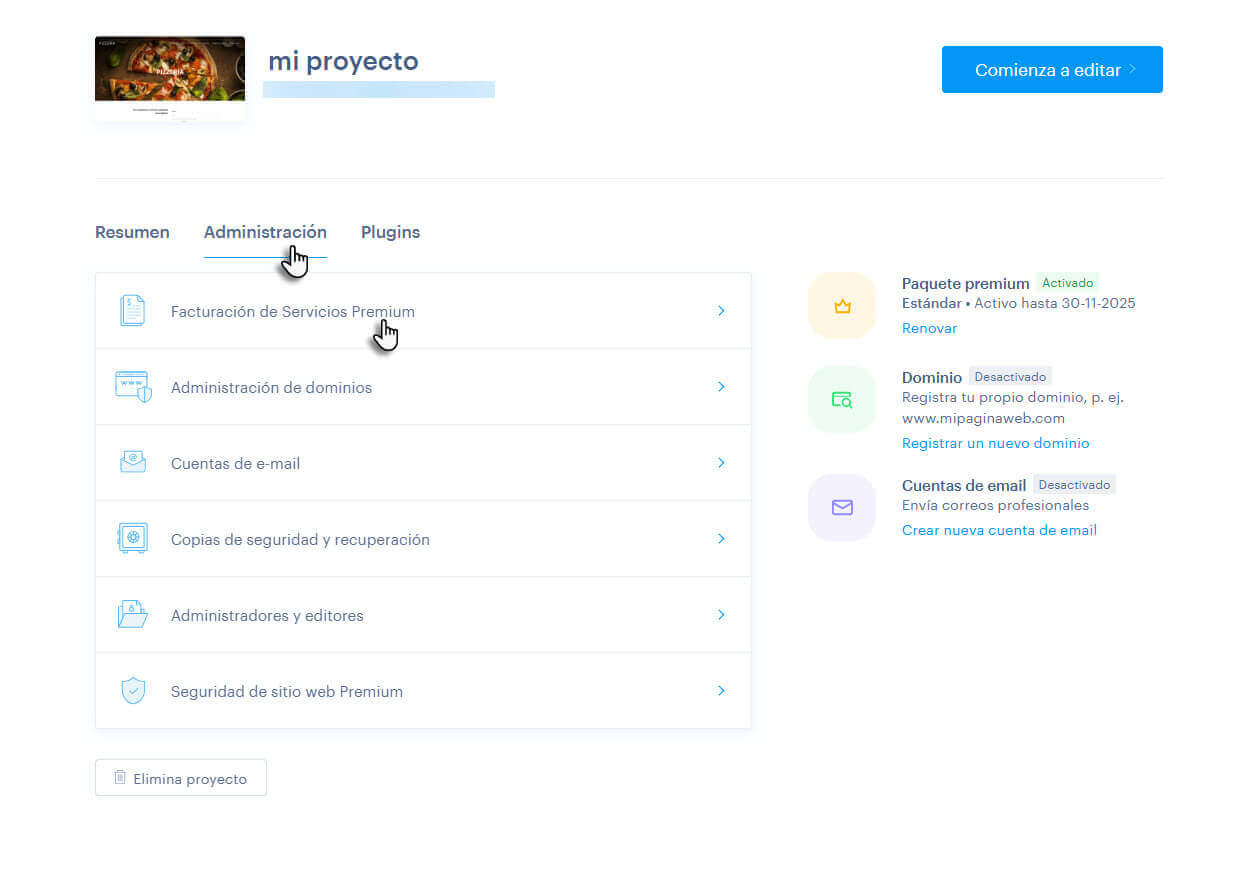 SUGERENCIA: Cada vez que pagas con tarjeta, se crea automáticamente una suscripción. Por eso, si amplías tus servicios, puedes hacerlo directamente desde la administración del proyecto, usar una tarjeta nueva, y la suscripción se vinculará automáticamente a ella.
