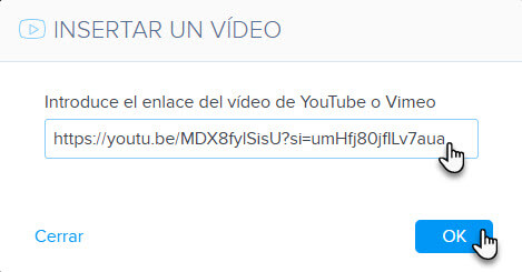 4. Inserta un enlace de YouTube o Vimeo y confirma haciendo clic en OK.