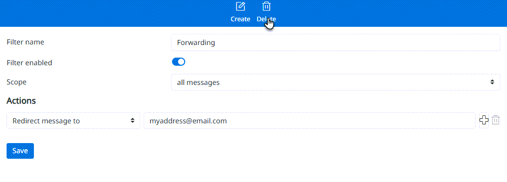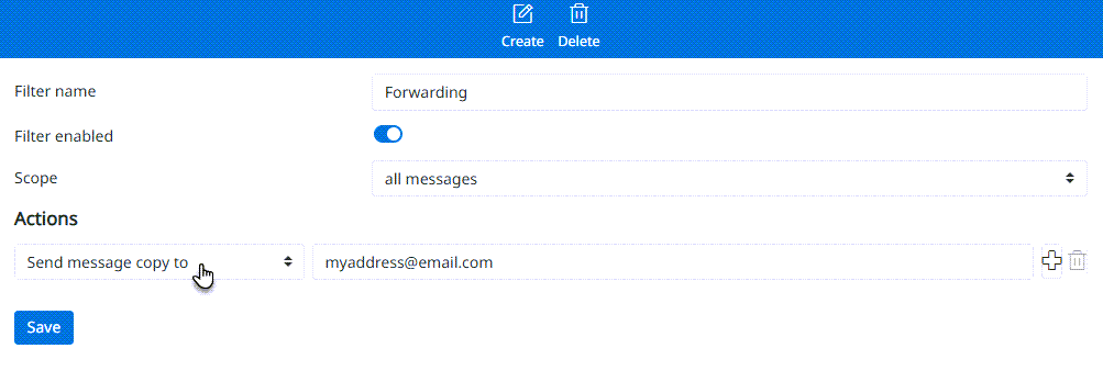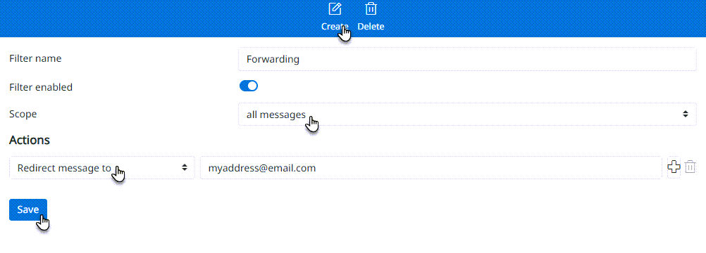 3. Napsauta oikeasta yläkulmasta Create. Anna suodattimelle nimi. Valitse Scope: All messages, Action: Redirect message to ja syötä sähköpostiosoite, johon viestit ohjataan.