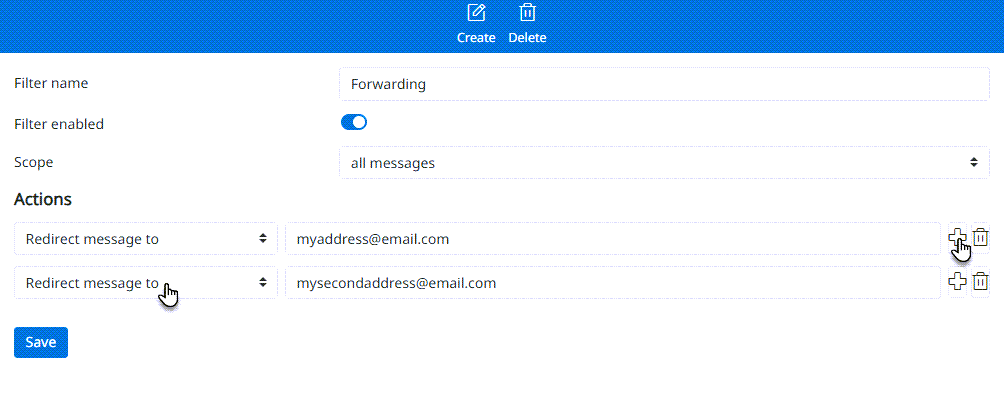 Jos haluat ohjata viestit useaan osoitteeseen, klikkaa plus-painiketta ja valitse uudelleen Redirect message to.