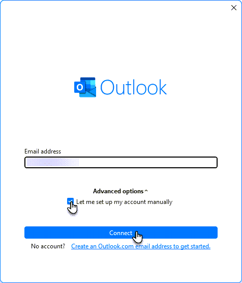 3. Syötä sähköpostiosoitteesi, valitse Salli manuaalinen tilin määrittäminen ja klikkaa Yhdistä.