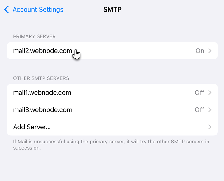 Asetusten päivittäminen on yksinkertaista – sinun tarvitsee muuttaa vain kaksi arvoa: saapuvan ja lähtevän postin palvelimet. Korvaa vanhat palvelimet (mail1.webnode.com, mail2.webnode.com tai mail3.webnode.com) uusilla: imap.mail.webnode.com (saapuva) ja smtp.mail.webnode.com (lähtevä). Kaikki muut asetukset pysyvät samoina.