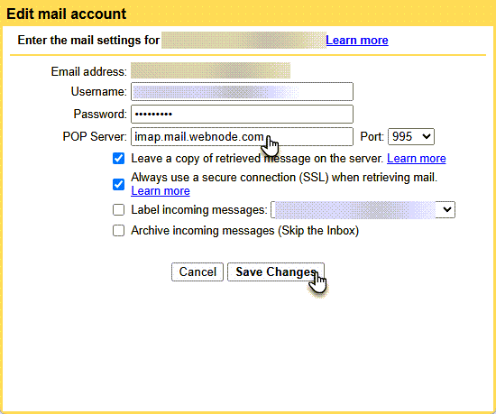6. Vaihda palvelin osoitteeseen imap.mail.webnode.com.