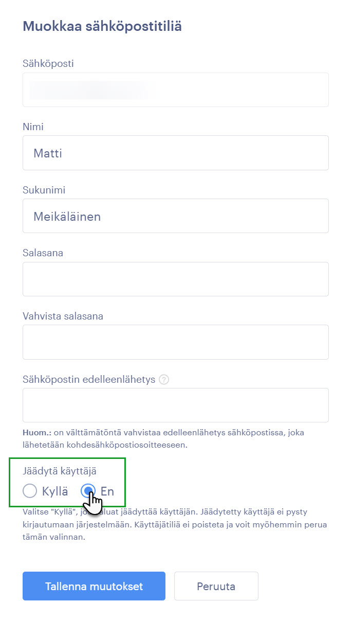 Jos sähköpostiosoite on estetty projektin asetuksissa, postia ei toimiteta. Tarkista, onko osoite todella estetty.