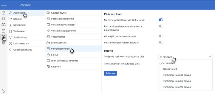VINKKI: Voit myös määrittää automaattisen poistamisen. Siirry Asetuksiin, valitse Asetusprofiilit, ja lopuksi Palvelinasetukset, joista voit asettaa, milloin Roskakori tyhjennetään automaattisesti.