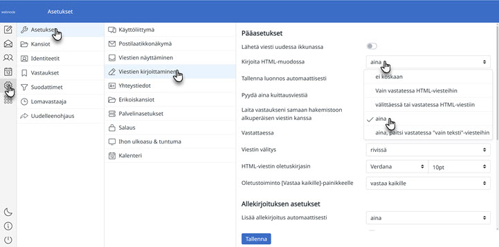 VINKKI: Jos käytät ulkoisia sähköpostiohjelmia, ne täytyy myös konfiguroida oikein. Samankaltaisia ohjeita löydät Ohje‑keskuksemme Ulkoinen sähköpostiohjelmat -osioista.
