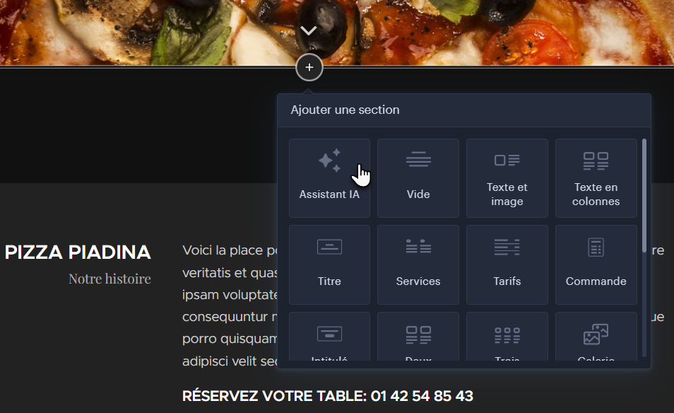 2. Cliquez sur ce bouton et sélectionnez le type de section Assistant IA.