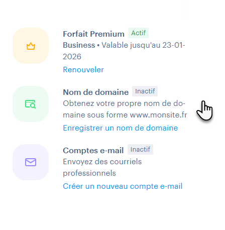 Domaine : Vous dirige vers la section Gestion des Domaines, où vous pouvez enregistrer ou transférer un domaine, consulter les domaines utilisés et vérifier leur expiration.