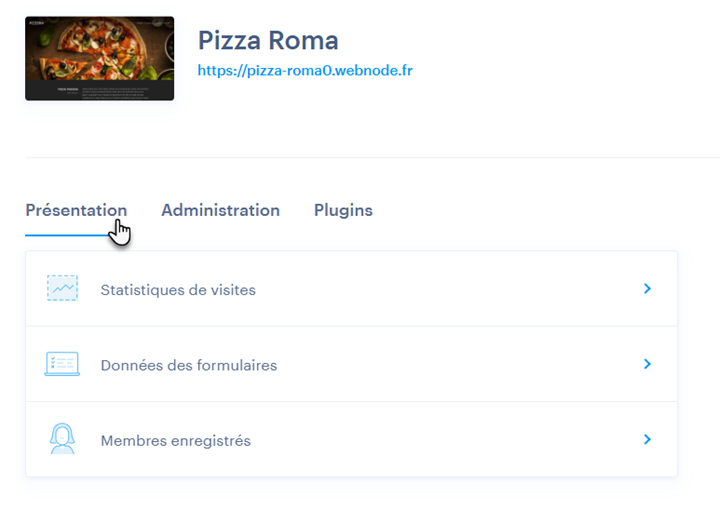 Statistiques du site web : cette section vous permet de suivre le trafic de votre site et, pour les boutiques, de consulter les revenus générés. Plus de détails dans l'article Gestion des commandes.