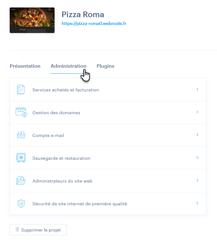 Supprimer le Projet : Ce bouton permet de supprimer le projet. Des instructions détaillées se trouvent dans le guide Comment supprimer un site web.