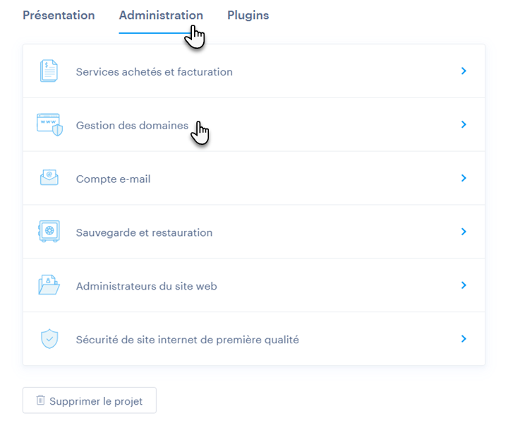 1. Dans l'administration de votre projet, accédez à l'onglet Administration et sélectionnez Gestion des domaines.